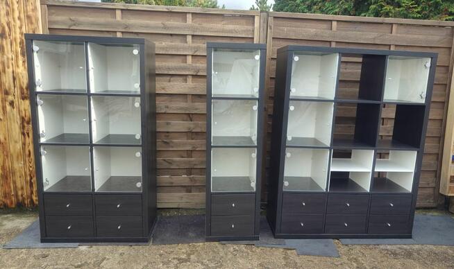 Komplet IKEA Kallax w kolorze czarnobrąz - regał 4x3 + 4x2 + 4x1 + szuflady + wkłady ze szklanymi drzwiami + półki. ...